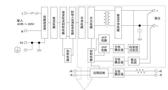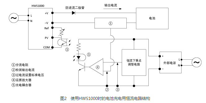 另一種控制恒流的方法是將外部電路連接到電源上,而不是像前面解釋的那樣通過過流保護轉移電流。以TDK的HWS1000為例來解釋這個過程:并聯電阻應用在電源的負載線上,輸出電流的電壓轉換是通過并聯電阻實現的,并進行輸出電流檢測。設計了恒流下垂點的調節電路,并建立了過流的標準電壓。在運算放大器中比較(2)和(3)的電壓,在光耦合器中控制電源的輸出電壓。